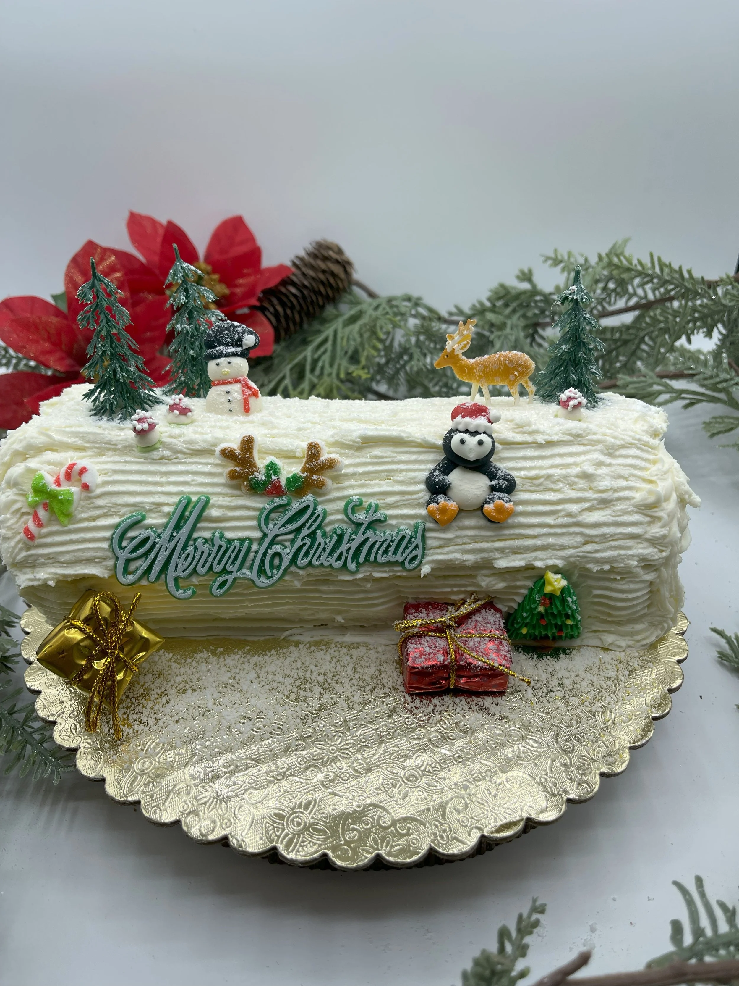 Light vanilla chiffon cake rolled in seedless raspberry jam, finished with your choice of rich chocolate buttercream frosting or smooth vanilla Chantilly cream that is skillfully done like “tree bark”. The log accented with artfully hand-decorated with buttercream Poinsettias. These are ideal as a centerpiece to holiday gatherings and a decadent dessert to finish off the end of a perfect evening.